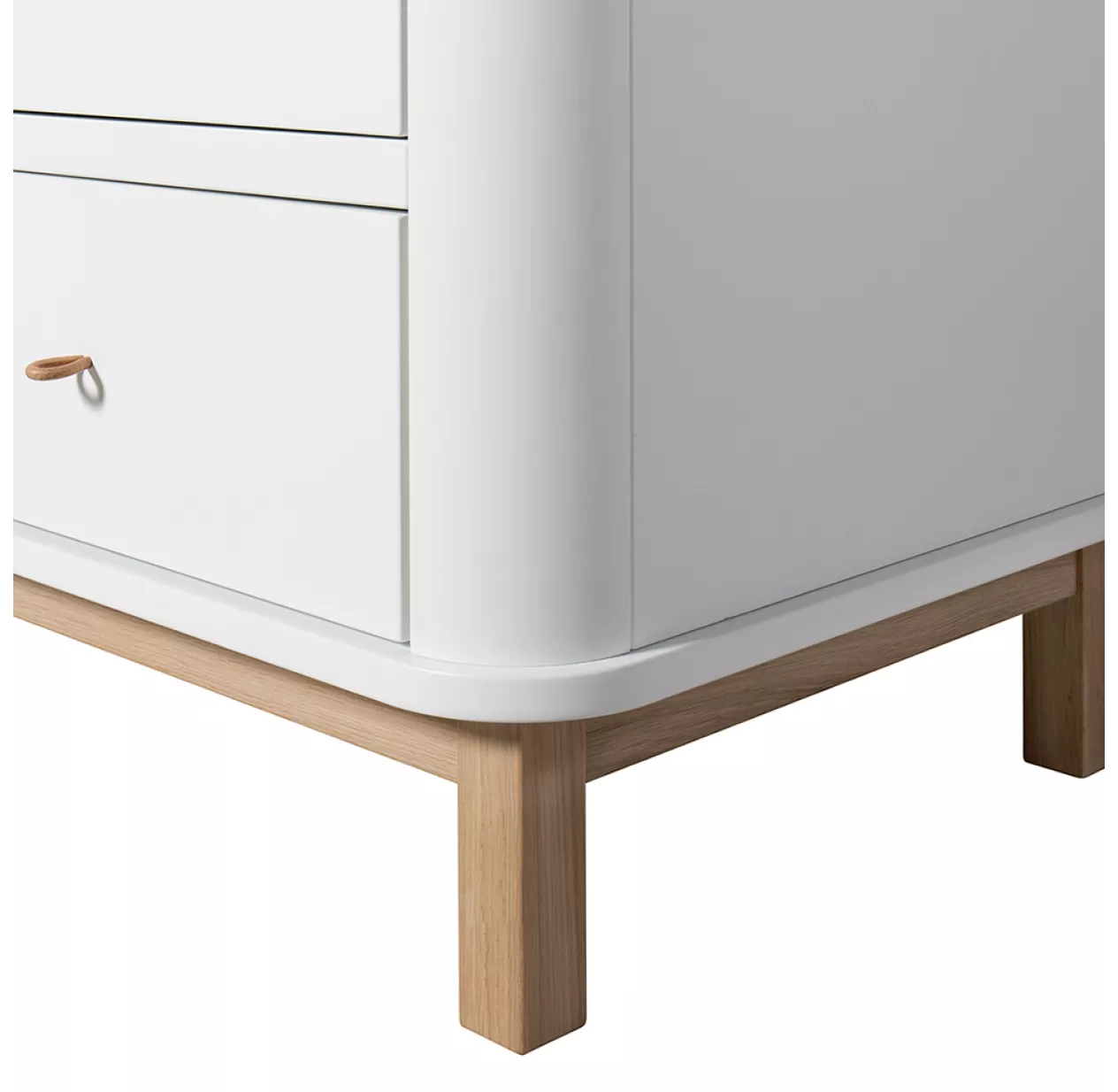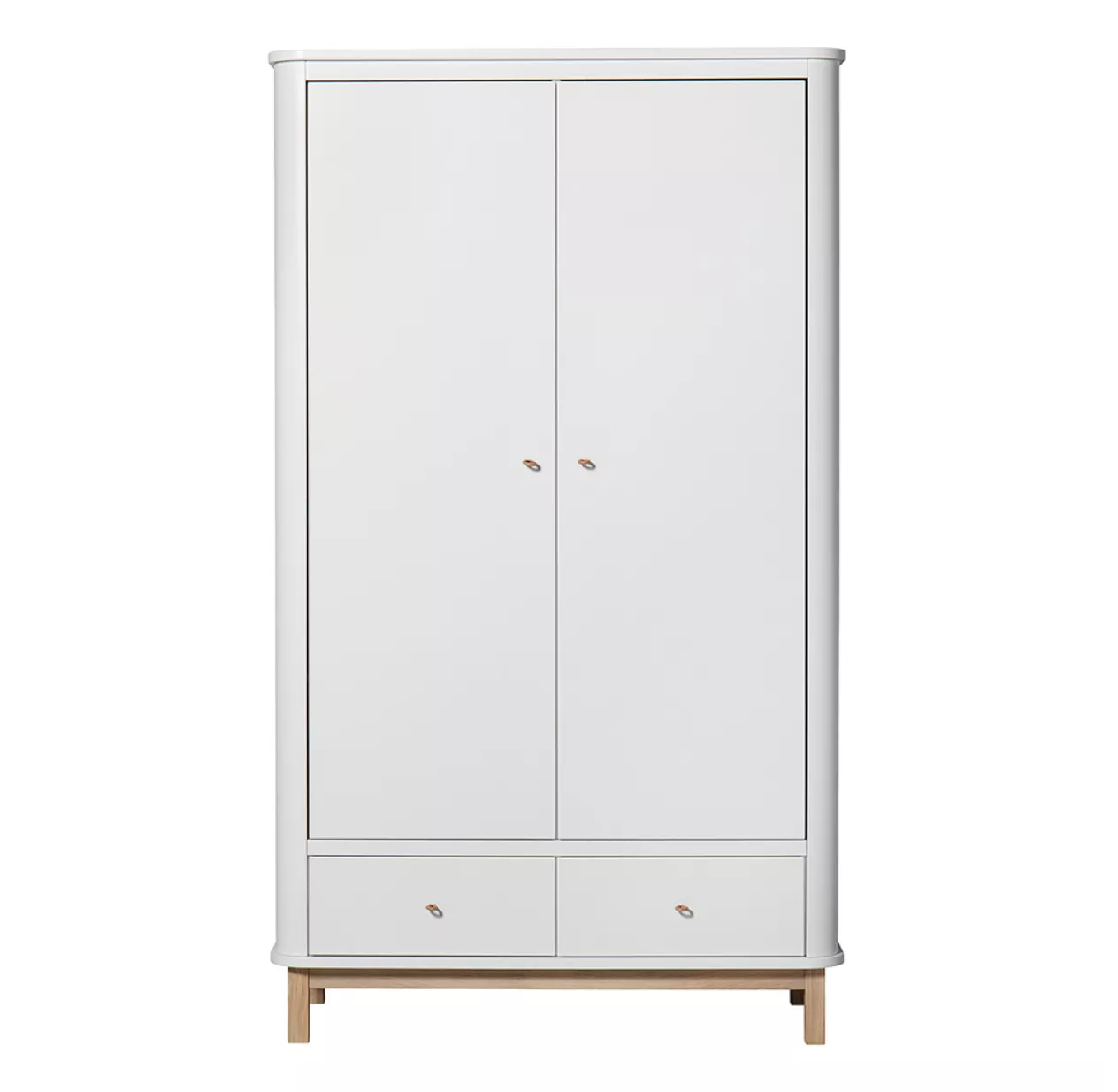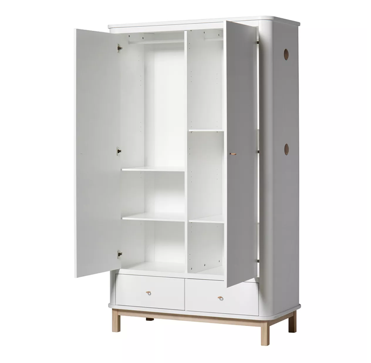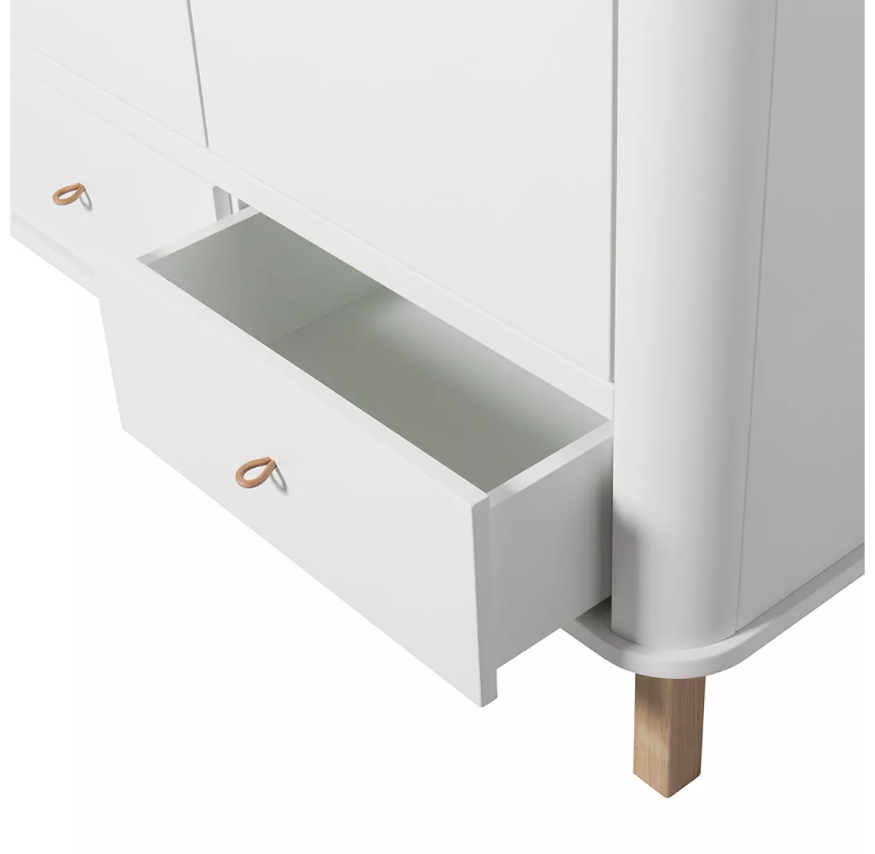 Craquez pour cette jolie armoire blanche et en chêne issue de la collection Wood. Conçue dans la tradition du design scandinave, cette armoire a été fabriquée pour durer. Avec ses lignes arrondies, elle apportera une décoration poétique à la chambre de vos enfants. Les poignées sont en cuir et sont fabriquées à la main. Une conception artisanale pour une armoire au design sobre, qui s’associera à merveille avec toutes les décorations. Elle possède 2 tringles, 2 tiroirs et de nombreux compartiments de rangement. Elle dispose également de petits portants ronds sur les côtés, extensibles qui se tirent facilement, pour suspendre des vêtements ou un sac.