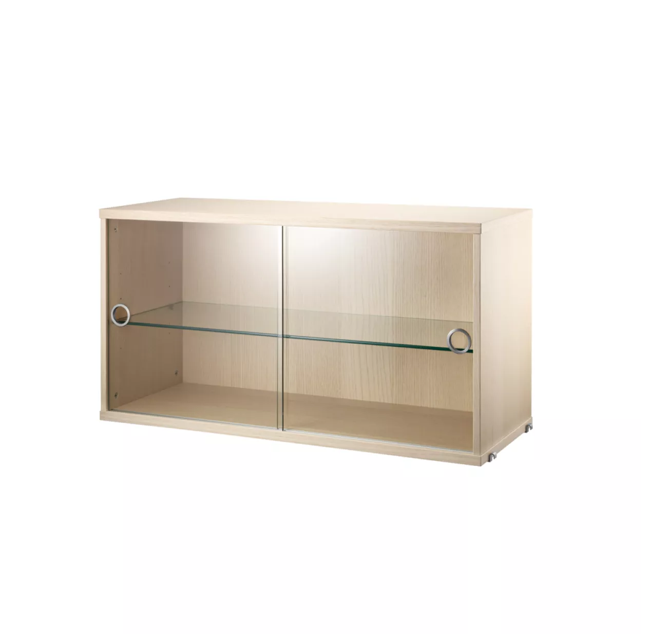 Ce caisson en frêne à portes vitrées coulissantes s’adapte aux portants muraux et portants au sol String. Vous pouvez créer votre propre composition murale grâce à ce caisson et créer un maximum de rangements.