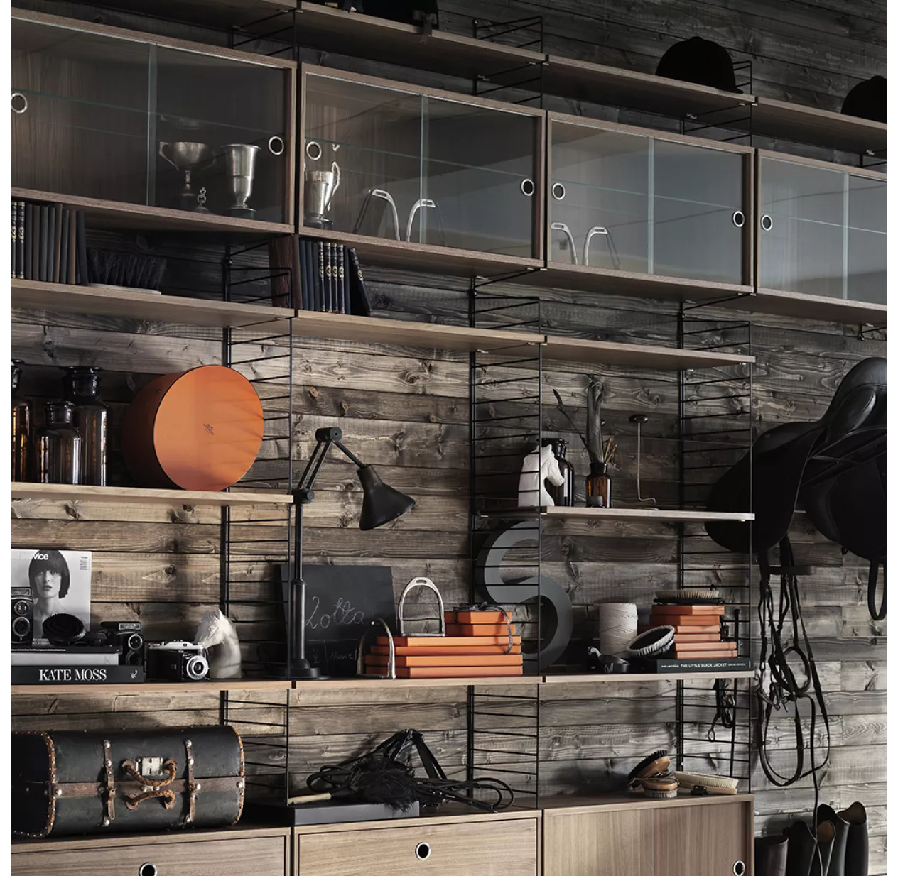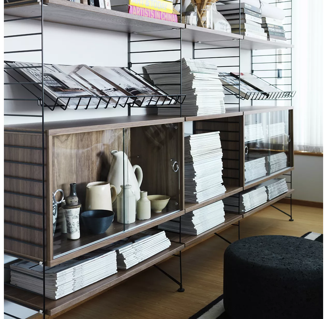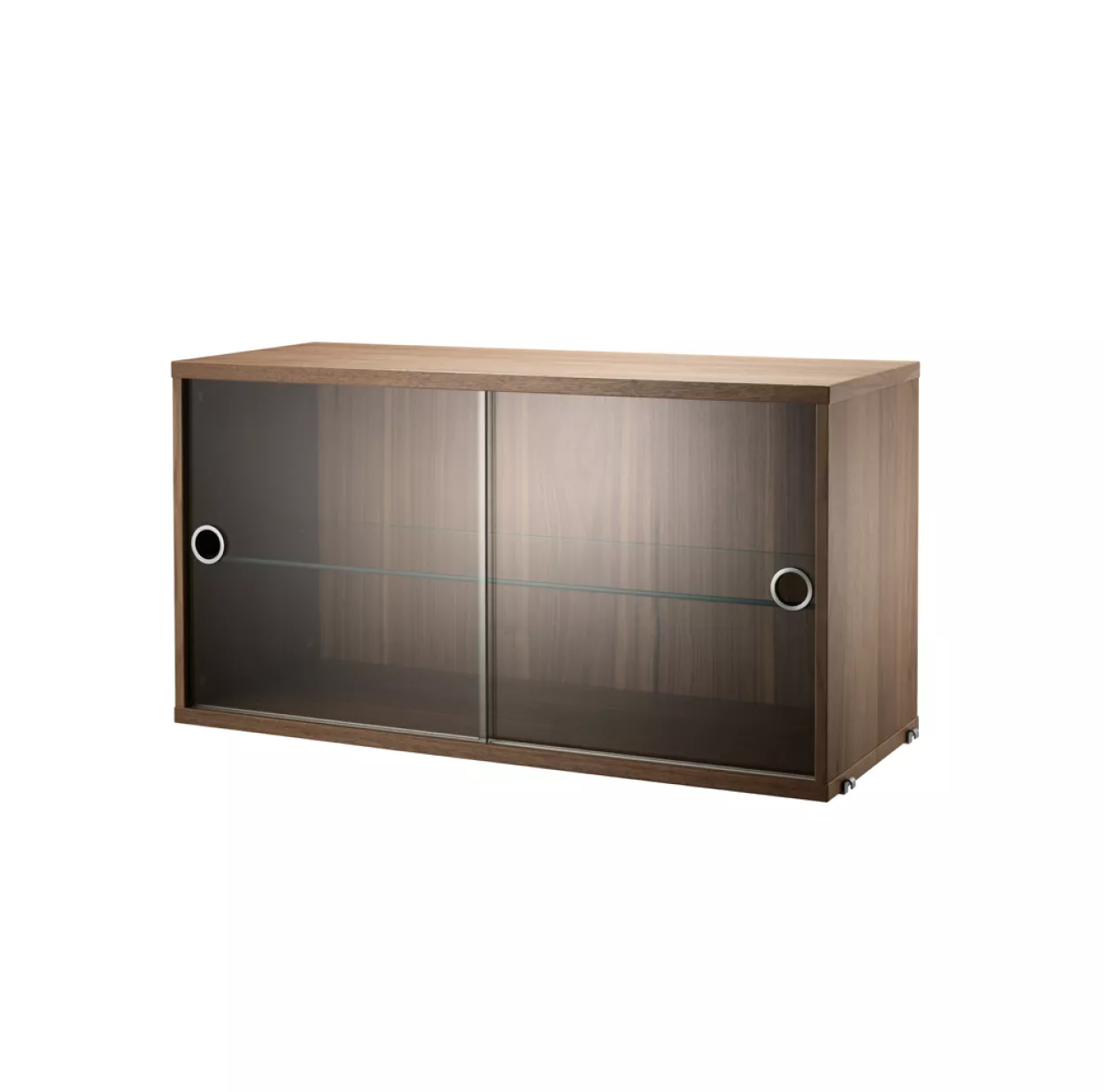 Ce caisson en noyer à portes vitrées coulissantes s’adapte aux portants muraux et portants au sol String. Vous pouvez créer votre propre composition murale grâce à ce caisson et créer un maximum de rangements.