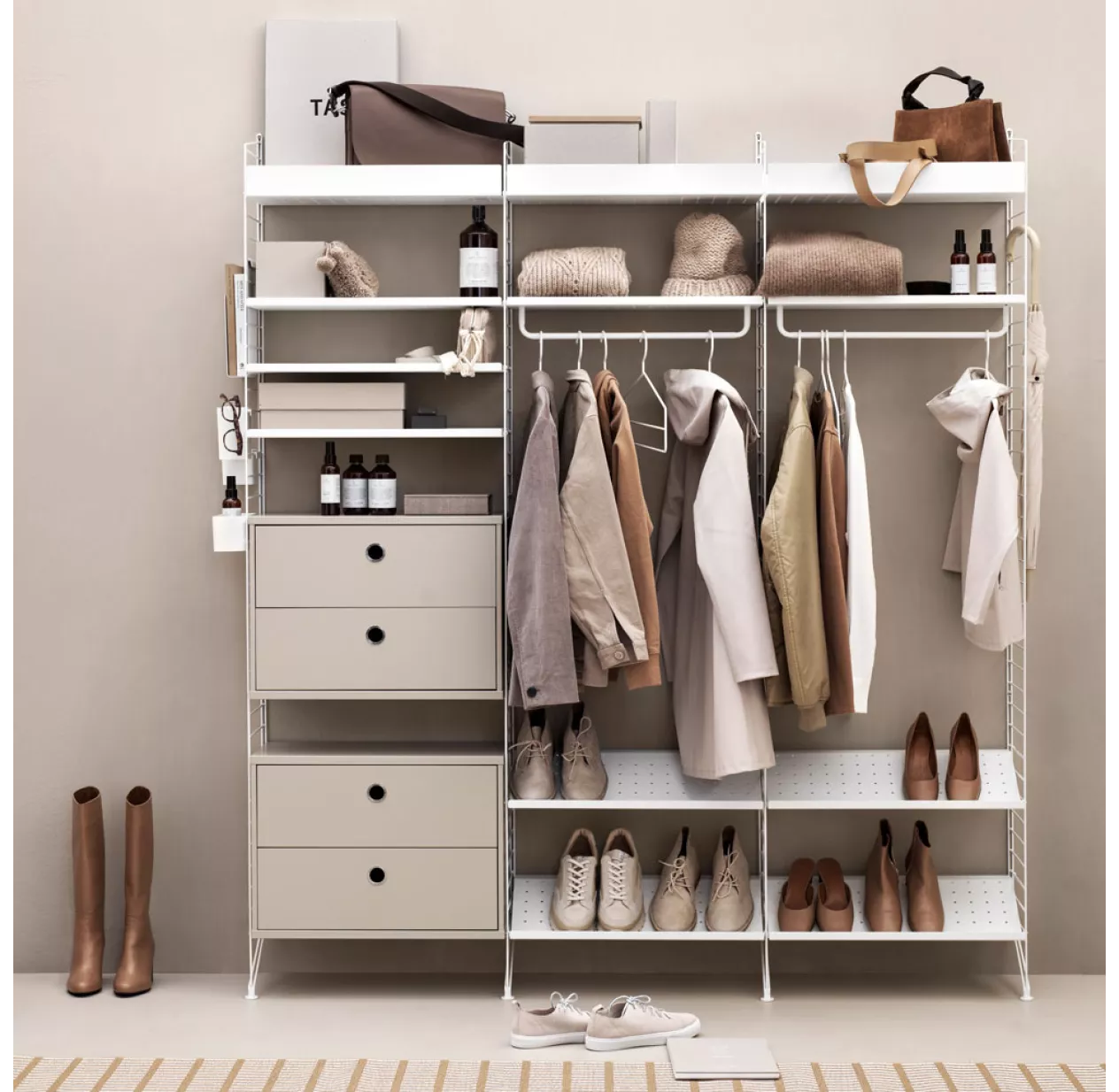Vous pouvez également rajouter les étagères pour magazines, les étagères métalliques ou en bois, le plateau de bureau et tous les autres rangements modulables String. Vous pouvez aussi mélanger les couleurs.