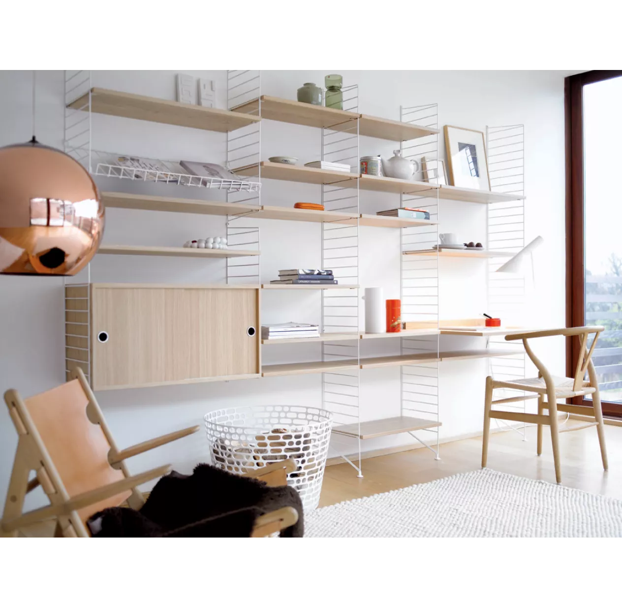 Vous pouvez également rajouter les étagères pour magazines, les étagères métalliques ou en bois, le plateau de bureau et tous les autres rangements modulables String. Vous pouvez aussi mélanger les couleurs.
