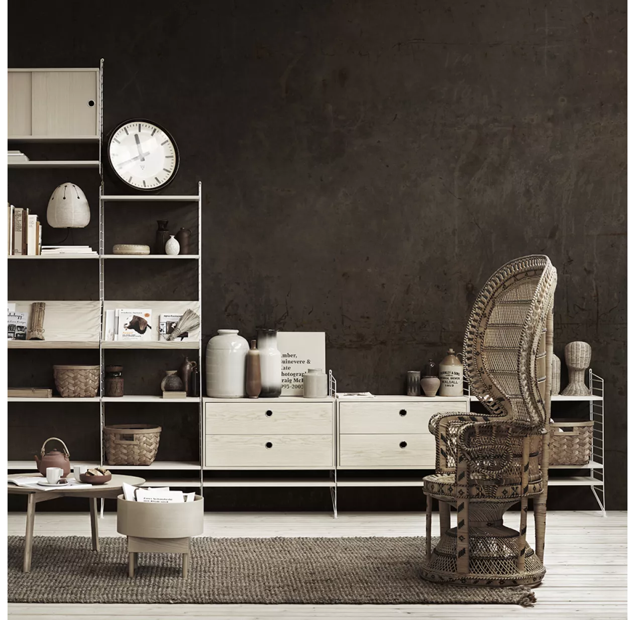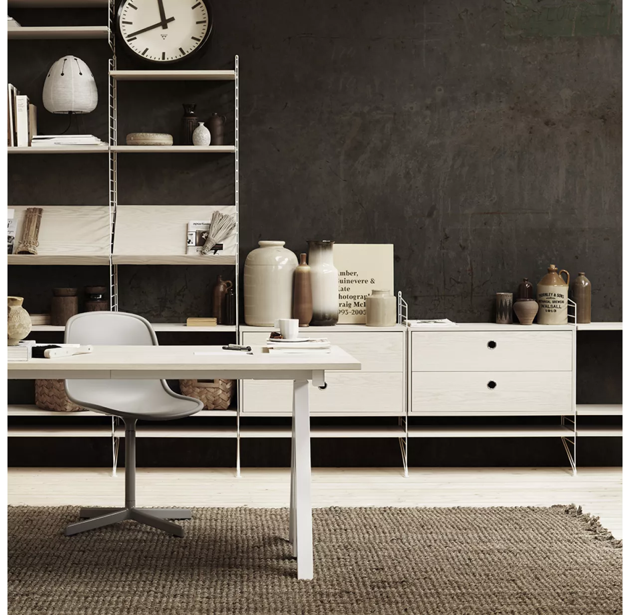 Vous pouvez également rajouter les étagères pour magazines, les étagères métalliques ou en bois, le plateau de bureau et tous les autres rangements modulables String. Vous pouvez aussi mélanger les couleurs.