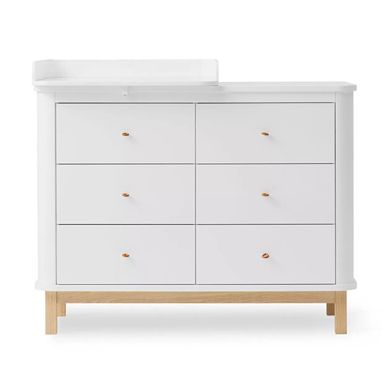 Cette commode blanche et en chêne de la collection Wood, possède 6 tiroirs et un petit plan à langer, vous pourrez donc changer votre bébé en toute facilité. Craquez pour son design scandinave et épuré, pour une chambre à la décoration légère. Les poignées de la commode sont en cuir et sont fabriquées à la main. De fabrication artisanale, vous allez l’adorer. Elle dispose également de petits portants ronds sur les côtés, extensibles qui se tirent facilement, pour suspendre des vêtements. Très fonctionnelle, vous pourrez enlever le petit plan à langer de la commode, une fois que votre bébé aura grandi.