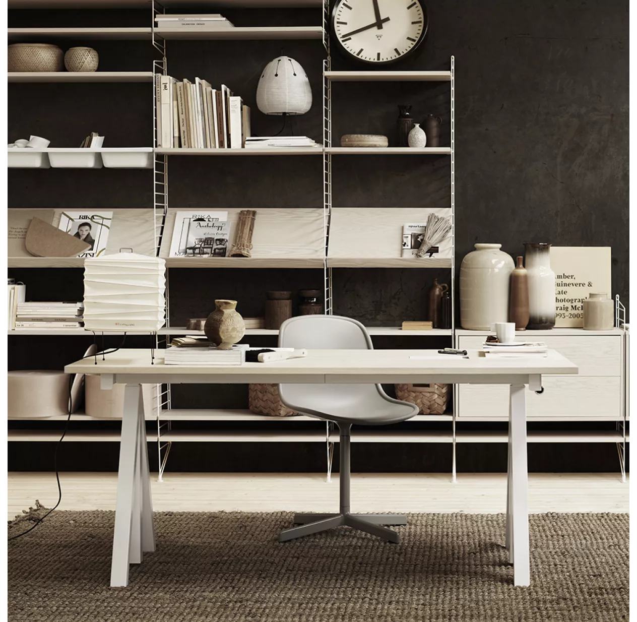 Vous pouvez également rajouter les caissons de rangement, le plateau de bureau, les étagères métalliques ou en bois, la table murale pliante et tous les autres rangements modulables String. Vous pouvez aussi mélanger les couleurs.