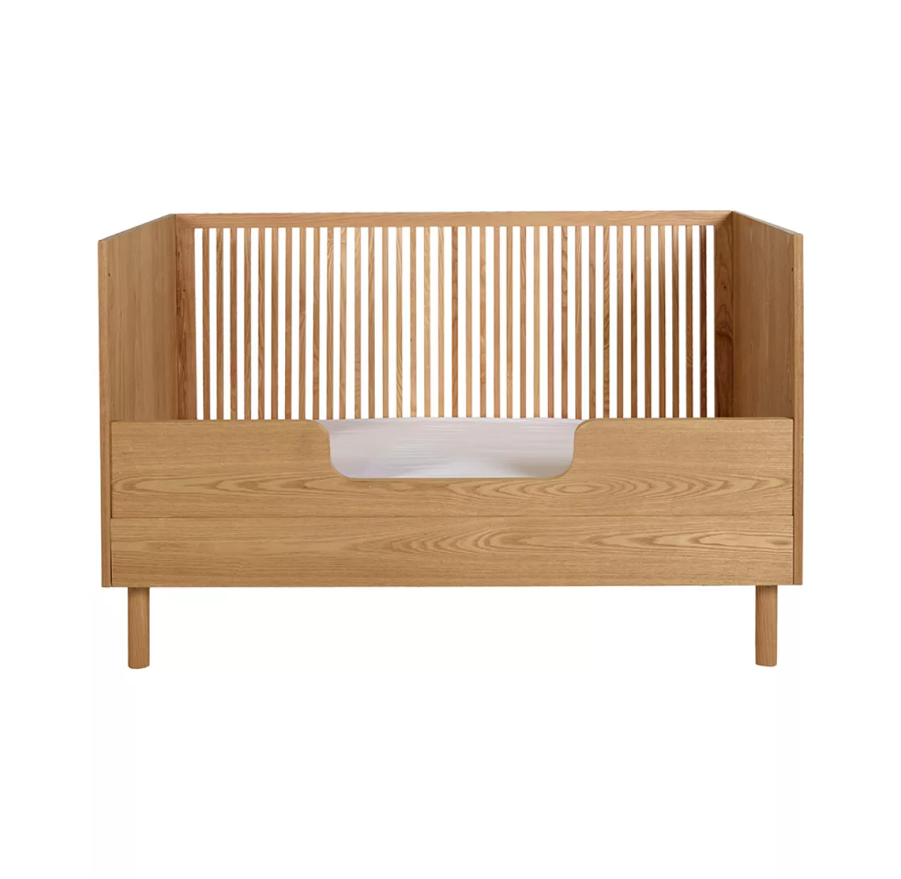 Le lit bébé évolutif Hai No Ki de Quax est élégant, pratique et durable. Coup de coeur de cette saison, ce lit bébé à barreaux d’inspiration japonisant et vintage n’est pas sans rappeler le design de Charlotte Perriand. Son couchage en 70 x 140 cm lui permet d’accueillir votre bébé plus longtemps. Il se transforme en un lit junior design avec l’ajout d’une barrière disponible en option, ce qui lui permet d’accueillir votre enfant jusqu’à 6-7 ans environ. Son sommier à lattes offre un couchage confortable et qualitatif. On craque pour ses lignes épurées et sobres qui font de ce lit évolutif un joli meuble au style intemporel. Il se transforme aussi en une banquette rétro en retirant simplement l’un des côté du lit. Le lit bébé évolutif Hai No Ki de Quax s’associe parfaitement à la commode ou à l’armoire de la même collection pour une chambre bébé complète.