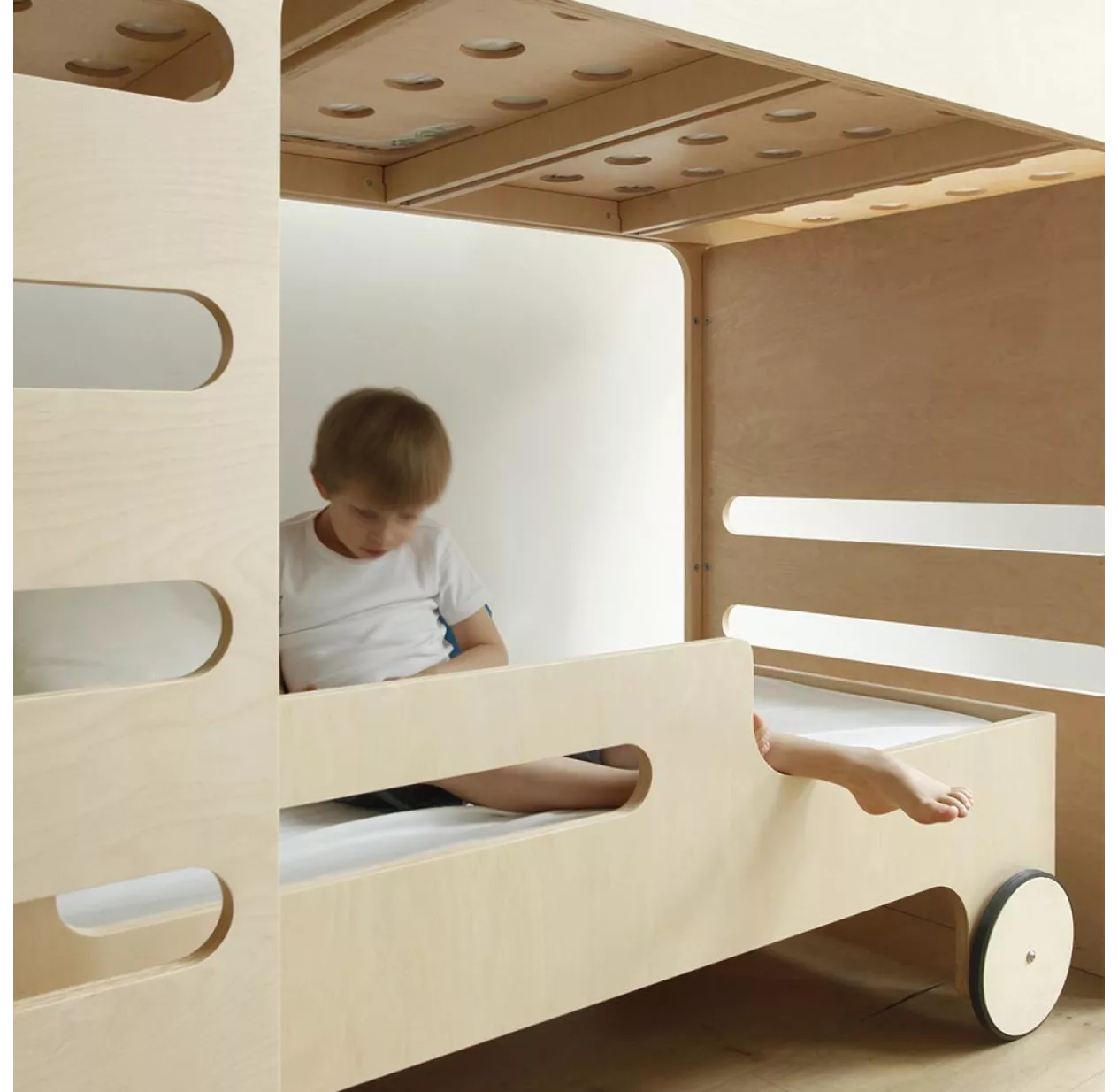 Le lit junior R Toddler Bed dispose de 2 roues qui joignent l’esthétique au fonctionnel. Elles lui donne un air de véhicule imaginaire comme pour mieux laisser vagabonder ses rêves. Le lit junior R Toddler Bed dispose de barrières de sécurité ajourées qui permettent à l’enfant de regarder ce qu’il se passe de l’autre côté.