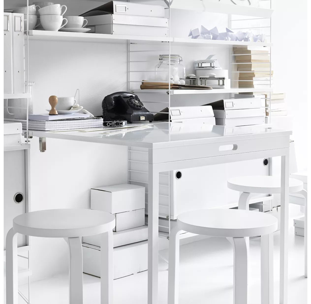 Grâce Ă cette table murale pliante blanche, vous pouvez crĂ©er votre propre composition murale. Un Ă©lĂ©ment design pour crĂ©er un espace qui vous ressemble. Elle s’adapte aux portants muraux et portants au sol String.
