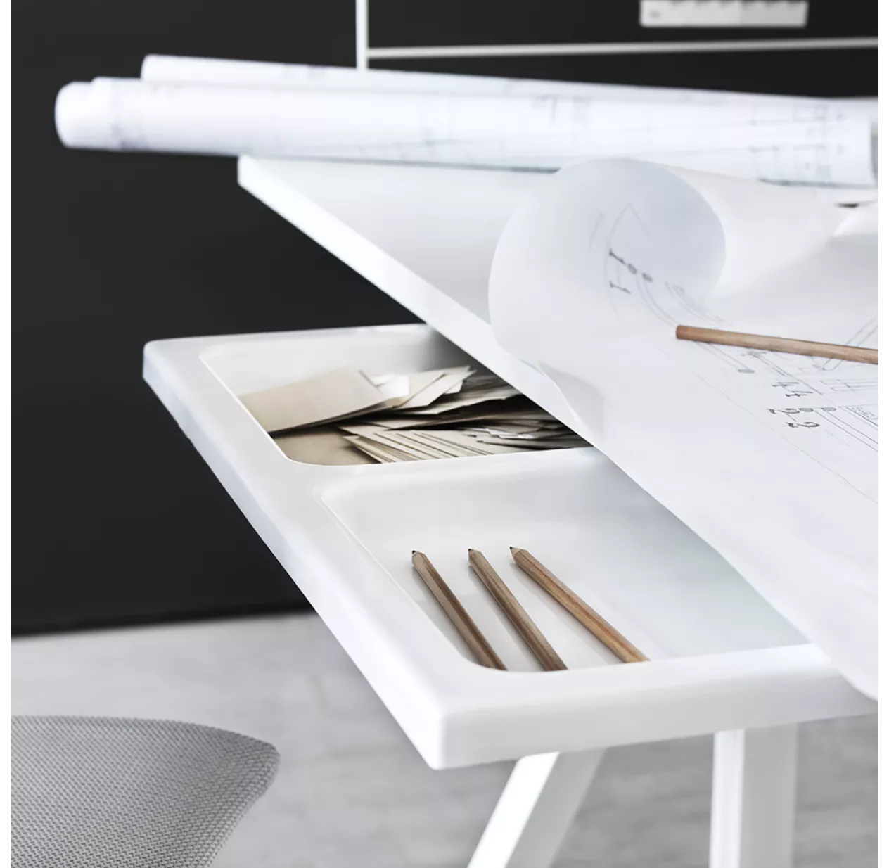 CrĂ©ez plus de rangements, grâce au tiroir qui s’adapte sur le plateau de bureau pour piètement.